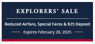 2025-2027 OCEAN CRUISE AND AIR FARES: Offer applies to bookings made from February 1-28, 2025. Terms & conditions for select promotions may vary. $25 deposit is applicable to all itineraries except World Cruise products. Special fares plus up to FREE airfare valid on select departures of Canada & New England Scenic Shores, Eastern Seaboard Explorer, Panama Canal & Central America, Panama Canal & the Pacific Coast. Airfares may vary on other gateways & departures. Airfare does not have to be purchased to get cruisecruisetour offer. All prices are in US dollars and for US residents only. Additional restrictions may apply. 2025: Pay in full by March 15, 2025 or at time of booking if within 120 days of departure. 2026: Pay in full by June 15, 2025. 2027: January 15, 2026 Offer may be withdrawn at any time without prior notice. Offers Expires February 28, 2025.